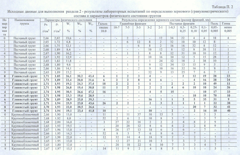 Для этого рассчитать нормативные характеристики крупнообломочного, песчаного и глинистого грунта (задание для расчета располагается в таблице П.2). Классифицировать грунты по ГОСТ 25100-2011.